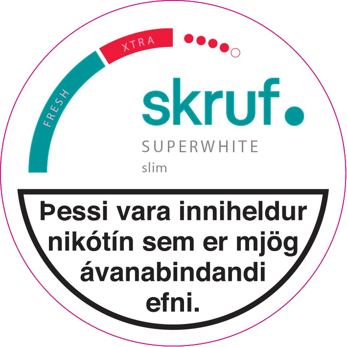 | Tegund | Blackberry/Björnbær #2 Normal, Cassice #2 Normal, Nordic Liquorice #2 Normal, Polar #3 Strong, Skruf Fresh #2, Skruf Fresh #3, Skruf Fresh #4, Skruf Fresh #5 Black, Skruf Frozen Mint #4, Solbær #3 Strong |